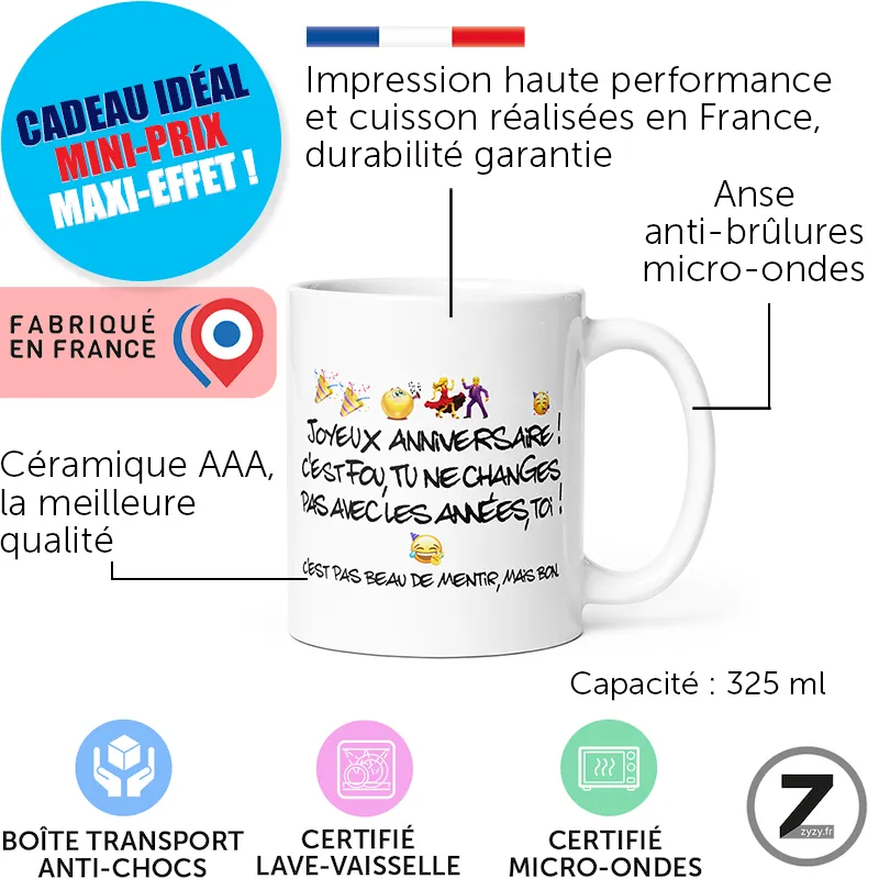 Ce mug humour 63 ans n’est pas qu’un cadeau original humour, c’est une véritable arme anti-morosité. Idéal comme cadeau d’anniversaire, il séduit aussi en mug Noël, en mug St Valentin ou en cadeau collègue plein de bonne humeur. Avec son design amusant et sa phrase culte, il deviendra rapidement la tasse drôle préférée du bureau ou du petit déjeuner. Même ceux qui n’ont plus 20 ans y trouveront une belle raison de sourire avant le premier café.