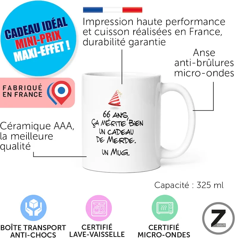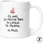Parce qu’à 63 ans, on a tout vu, sauf peut-être un Mug humour ANNIVERSAIRE DE MERDE 63 ans, aussi décapant ! Ce mug rigolo est l’allié parfait pour affronter un anniversaire de merde avec le sourire. Subtilement impertinent, il offre une dose d’autodérision bienvenue pour célébrer la soixantaine sans drame. Ce cadeau humoristique transforme les rides en éclats de rire et les bougies en prétexte à un bon café. Un vrai Cadeau de merde
