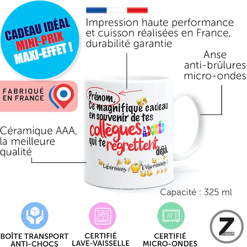 Conçu en France, ce mug allie qualité et humour : céramique AAA, anse anti-brûlures, couleurs éclatantes et compatibilité micro-ondes et lave-vaisselle. Il est livré dans un emballage antichocs ultra-sécurisé, prêt à supporter les aléas du transport (et même les livreurs un peu trop sportifs).